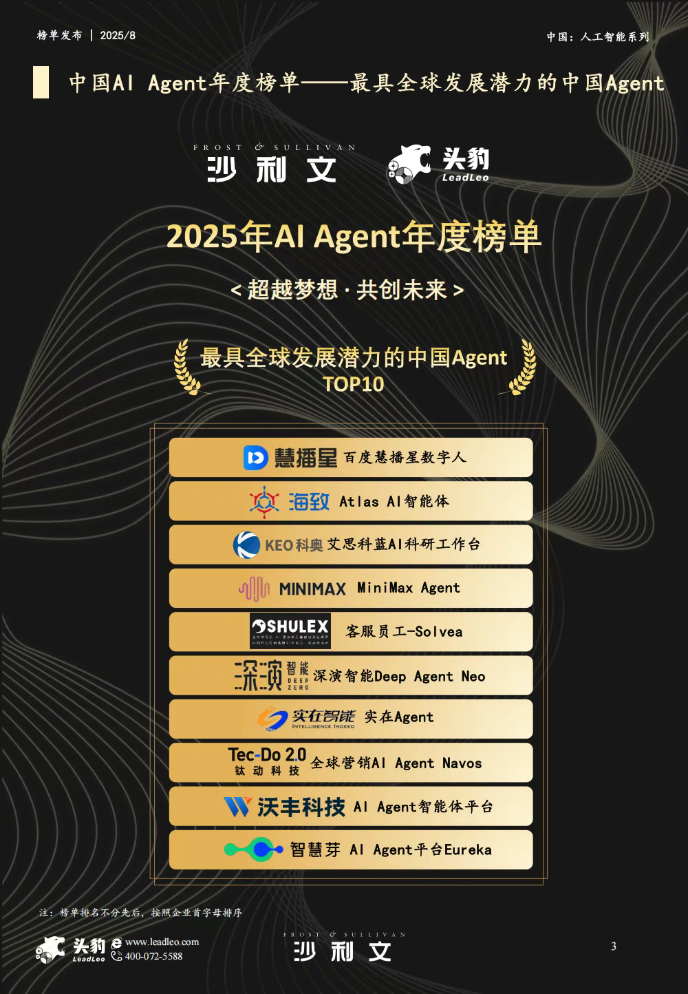 8月28日,全球知名咨询机构沙利文联合头豹研究院发布了《2025年中国AI Agent(智能体)最佳实践应用榜单》,凭借自主研发的 AI 智能体平台 Deep Agent Neo 的突出实力,z6mg·人生就是博从 150 家参评企业、近 300 个产品 / 解决方案中脱颖而出,成功入选 “最具全球发展潜力的中国 Agent” TOP10 榜单,再度印证其在 AI Agent 领域的技术硬实力与全球化发展潜力。